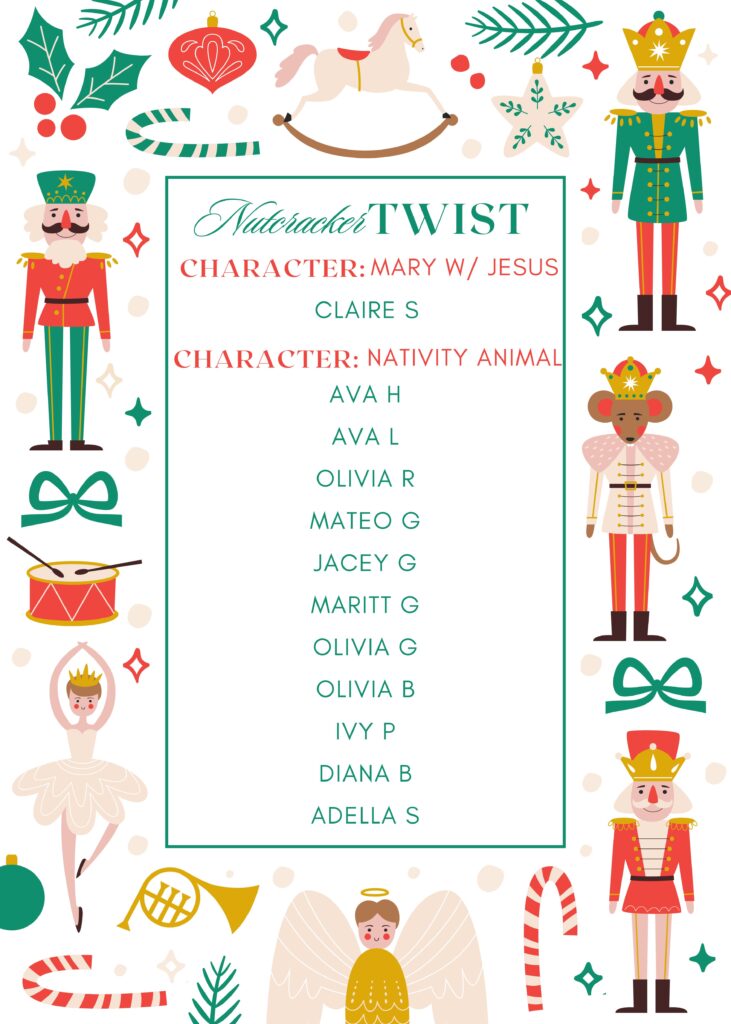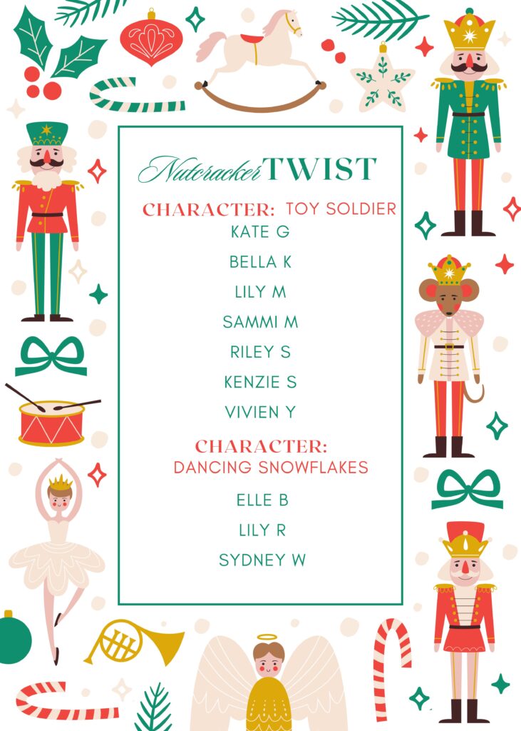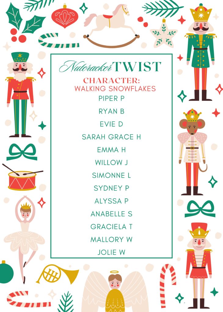 Opening Snowflake Dancers (2)– Dancers will need to wear white tights & white sneakers. The studio will provide the Snowflake costume & white dance pants for a rental fee of $25. Full Stage Make-up & Hair in bun.
